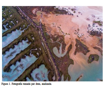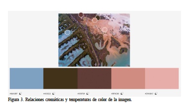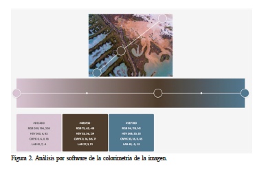 Para el análisis consideraremos una fotografía tomada por dron (Figura 1). A nivel contextual la pieza presenta los datos que siguen. Autoría: Blanco Pérez, Manuel (piloto y fotografía, autor único). Sin título. 13 de octubre de 2017. Hora: 11:26. Género: Fotografía de naturaleza 2D (plano cenital). A nivel morfológico la fotografía presenta una línea visual oblicua que, como si fuera una espina dorsal visual, de color verde de la vegetación, divide en dos el espacio. Una parte izquierda (con ramificaciones visuales) y una a la derecha (una masa visual de aire con color marrón). El terreno de la izquierda es, a su vez, un espacio formado por varias lenguas de mar, de color azul, complementario del verde de esa espina dorsal, mientras que a la derecha destaca, sobre todo, la masa de aire visual de color marrón texturizado y alguna mancha azul (agua de mar) y blanquecina. Puede presentar visualmente varias metáforas; una es la propia columna vertebral a modo de alegoría, pues en el fondo no deja de ser una reapropiación del mar a manos de la tierra, o al revés, si se quiere. Habla de la tierra como ‘matria’ e hilos conectores de diferentes realidades. Y sin duda presenta volúmenes ‘gradativos’ tonales en una gama de color complementaria (azules, verdes y rojizos -tierra-). A nivel sintáctico la luz es muy difusa, con una tamización muy envolvente que crea un juego de suaves formas y mínimos contrastes visuales, corregidos estos en postproducción. A nivel enunciativo (‘horizonte de expectativas’), los referentes están claros, por un lado la obra del fotógrafo francés Arthus-Bertrand (Arthus-Bertrand, 1999) y su serie sobre fotografías aéreas 2D (cenitales) de zonas selváticas y densos bosques y mares y, por otro lado, la visión mucho más local del fotógrafo andaluz Héctor Garrido (Garrido, 2015), una de cuyas obras (una pieza obtenida desde un helicóptero en Doñana) ha servido de portada para la multipremiada película de Alberto Rodríguez, La Isla Mínima, de 2014, donde el uso de planos aéreos fue profuso, y contribuyó a crear una atmósfera muy particular en el filme. Esta fotografía de dron aquí analizada, fue utilizada en 2018 para la carátula de la película andaluza Al Sur del Sur Manuel Blanco Pérez. En el último apartado, las coordenadas de vuelo son las siguientes. En primer lugar, el formato del archivo es RAW (DNG), editado en Adobe Lightroom y exportado en JPG. Exposimetría fijada en 0.0 con -1.0 para superficies azules del agua y +0.5 para las superficies de arena del ángulo superior derecho. Día con pocos vientos y sin presencia de térmicas. Altura aeronave: 200m, orientación este. Sin filtros físicos. A nivel colorimétrico la pieza se sustenta sobre el contraste del marrón rojizo y el azulado, junto al verde de la vegetación los tres complementarios. El análisis con Adobe color nos revela, también, la importancia de los tonos medios, tal y como muestra el análisis por software de su colorimetría (Figura 2).