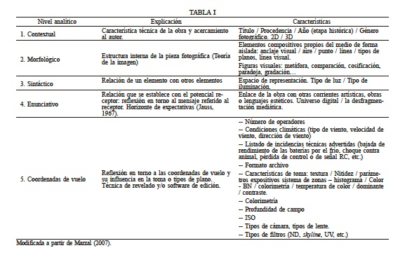 En este artículo se reflexiona sobre la fotografía y el audiovisual obtenido a través de la tecnología del dron, para trazar unas líneas sobre su taxonomía y, por último, ofrecer una herramienta de análisis visual fotográfico que, partiendo del modelo académico más aceptado en castellano (Marzal Fellici, 2007), esté adaptado a un nuevo medio, el dron, que es absolutamente revolucionario, y que obliga a una profunda reformulación de la antología fotográfica y audiovisual, al tratarse de una nueva manera de entender el medio, desde un nuevo lugar autónomo, el aire.