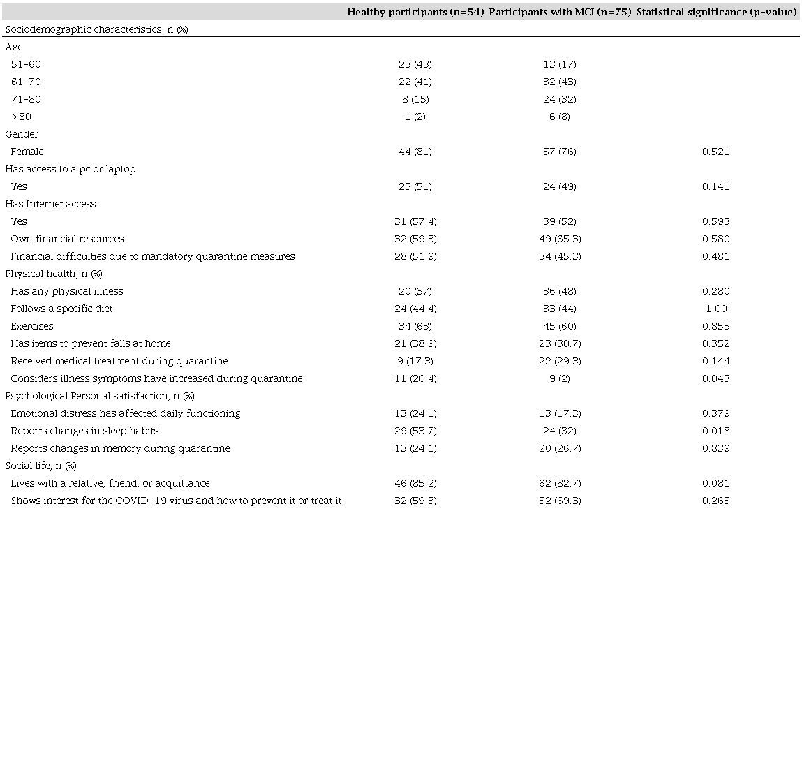 A total of 129 people were surveyed, the mean age was 66.4 (SD=8.1), 78% were identified as female, 28% of the participants were below 60 years old, and 72% were above 61 years old. According to a previous neuropsychological evaluation, 41.9% were considered healthy and, therefore, were part of the “healthy group” and 58.1% showed symptoms of MCI. The mean age of the healthy group was 63.6 (SD=7.2) and that of the “MCI group” was 68.4 (SD=8.2). All the results obtained from the survey show the physical, psychological, and social state perceived by the participants of the two groups in the quarantine. Table 1 shows a summary of the survey responses, including a comparison between the groups (healthy and with MCI).