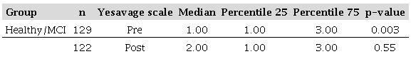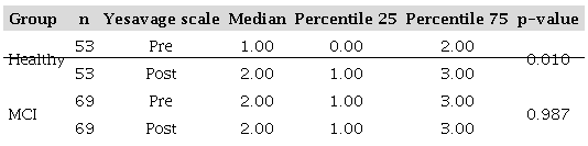 In the evaluation with the Yesavage Geriatric Depression Scale, statistically significant differences were found in the intragroup comparisons in the healthy participants (p=0.010) using the Wilcoxon rank-sum test ( Table 2). In contrast, when making an intergroup comparison of the Yesavage scale before and after quarantine in healthy participants and those with MCI, statistically significant differences were obtained in the pretest scores (p=0.003) using the Mann-Whitney U test ( Table 3).