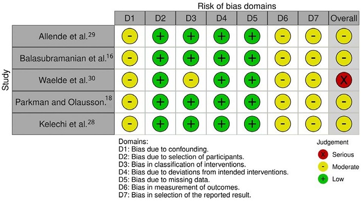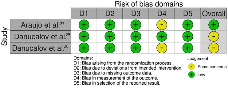 Regarding the RCTs, two of the studies 25, 27 provided detailed information on random sequence generation. Given the nature of the intervention, neither participants nor care providers were blinded in any of the studies evaluated. Only one study 25 explicitly reported blinding of outcome assessors. Due to the absence of blinding for outcome assessors, two RCTs were rated as having “some concerns” regarding the risk of bias.