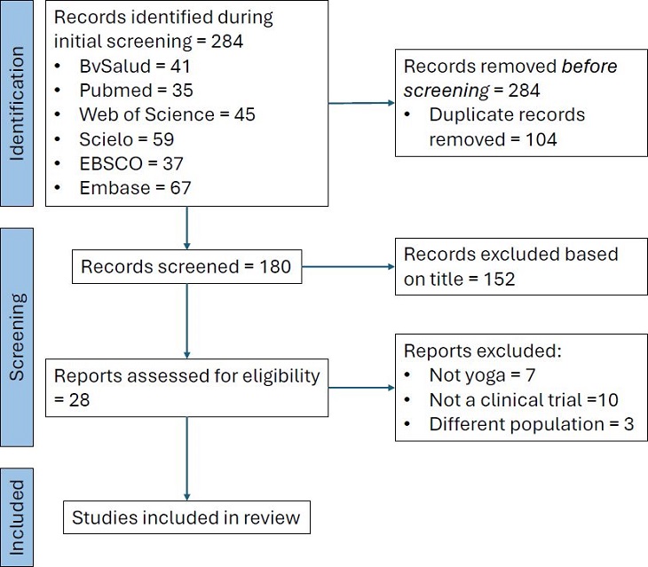 Methods: A comprehensive search was conducted on September 11, 2024, in databases including SciELO, PubMed, BVSalud, Web of Science, Embase, and PsycINFO, focusing on the effects of yoga for informal dementia caregivers compared to passive or active control groups through randomized and non-randomized trials. An initial review reduced 284 to 180 unique records; 172 studies were excluded, leaving 8 that met the inclusion criteria. Two authors independently selected and extracted data using a data extraction sheet based on the Cochrane Consumers and Communication Review Group. The Cochrane Risk of Bias tools (ROB2 and ROBINS-I) were employed to evaluate bias risk.