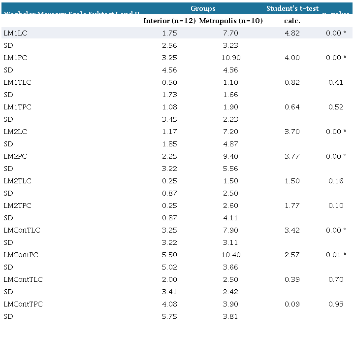 Statistics were assessed by the SPSS 12.0 software, having begun with the test of differences of average and variance (ANOVA) to verify whether there were any significant differences among groups, as well as if there was significance among original stories narrated from WMS and the story adapted to the reality of the subject. The procedure used for comparing both Interior and Metropolis groups was the Student’s t-test.