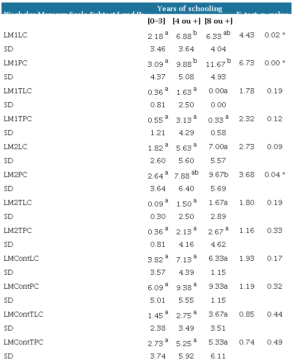 The procedure used to compare groups concerning the educational levels in Table 2 was the analysis of variance. The p<0.05 presented in Table 2 and indicated by (*) shows that there are significant differences between the groups considered and means followed by the same letters do not statistically differ among themselves at the level of 5% of significance. Thus, we reject the hypothesis that different levels of education do not produce different neuropsychological performances, that is, there are differences in the performance of groups of elderly people when considering different levels of education for the following neuropsychological tests: LM1Lit, LM1Prop, and LM2Prop.