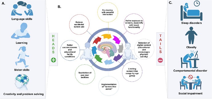 ABSTRACT: Like a coin, the impacts of screens on children’s development have two sides, as reflected in current scientific knowledge. This narrative review aimed to explore the dual-faceted state of the art regarding screen use, highlighting both positive and negative aspects on neurodevelopment, intervention proposals, and future perspectives for appropriate screen use. Recent scientific findings emphasize two central points: on the one hand, the benefits of appropriate use, such as co-viewing and the use of educational content; on the other hand, the negative impacts of excessive screen use, passive, and non-educational use on the development of neural networks. In this sense, with the advent of the digital age and in light of current scientific results, it is clear that eliminating screens from daily life is unrealistic. Therefore, implementing strategies to ensure a healthy balance between screen time and other activities important for child development is essential.