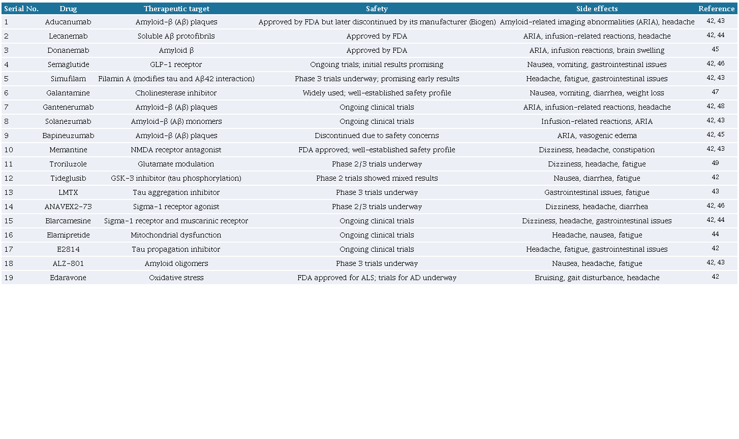 Drugs such as metformin, pioglitazone, and sildenafil have been investigated for their neuroprotective effects. While these agents are well-tolerated in non-AD populations, their impact on cognitive outcomes and safety in AD requires further exploration.