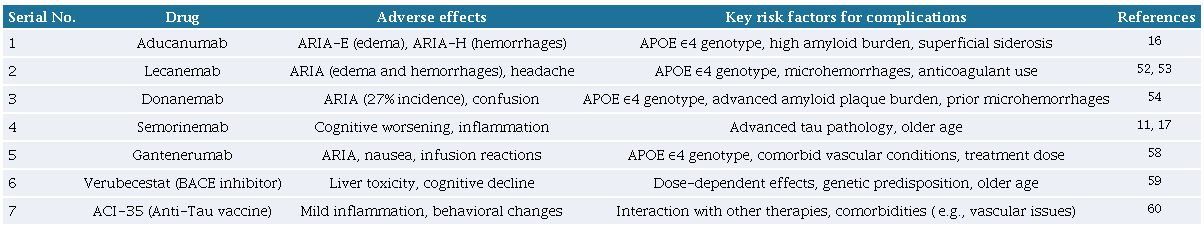 Table 211, 16, 17, 52– 54, 58– 60 describes the brief safety profile of new treatments in AD.