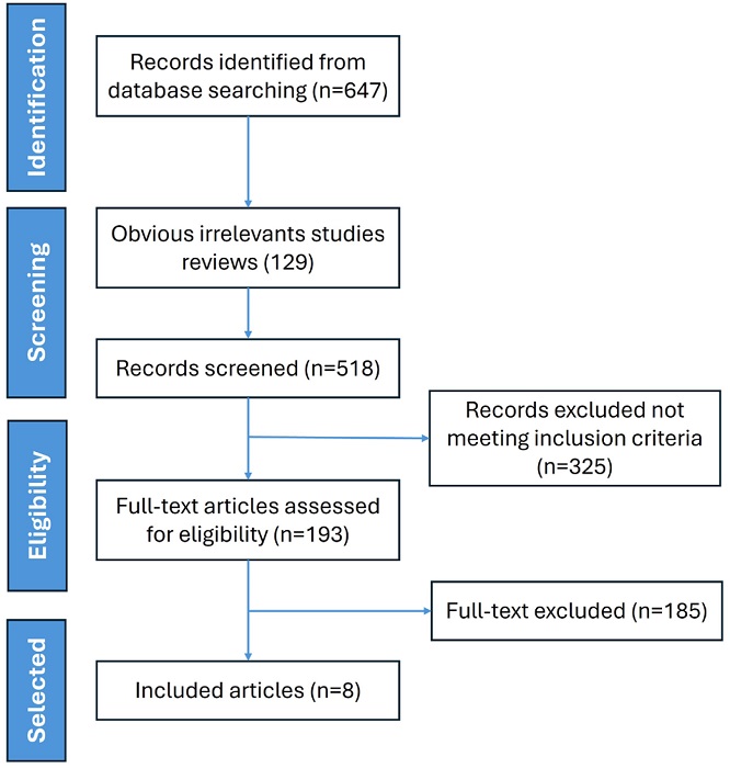 A comprehensive overview of the search strategy is presented in the PRISMA flowchart ( Figure 1), highlighting the stepwise process of study retrieval and inclusion for this systematic review. A total of 647 articles were identified through electronic database searches using predefined search terms. Upon removal of duplicates, review articles, editorials, commentaries, case reports, or abstracts lacking sufficient data, 193 articles underwent abstract screening and full-text review, with selection based on the investigation of the association between BIR and AD. Ultimately, eight studies met the inclusion criteria and were selected for data extraction and analysis.