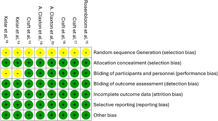 A risk of bias assessment was conducted using the Cochrane Collaboration Network's RoB tool. Results indicated an overall low risk of bias, although uncertainties were identified in certain areas, including random sequence generation and participant blinding in some studies. Figure 213- 20 and Figure 313- 20 provided detailed assessments, with the crossover study by Rosenbloom et al. 15 showing low risk, primarily due to its robust design.