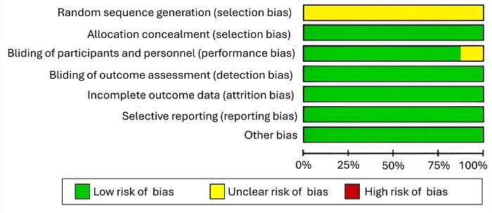To ensure methodological rigor and transparency, the Cochrane risk-of-bias tool version 2 (ROB2) was employed to evaluate the included RCTs 11. This standardized tool facilitates a systematic assessment of potential bias across critical domains that could influence study outcomes. These domains encompass: the generation of random sequences to prevent allocation predictability; the implementation of allocation concealment to mask treatment assignment until intervention initiation; the blinding of participants, personnel administering interventions, and outcome assessors to minimize performance and detection bias; the extent of missing outcome data to evaluate the potential for attrition bias; the selective reporting of pre-specified outcomes to safeguard against reporting bias; and the exploration of any other potential sources of bias not captured within the aforementioned domains. Through this comprehensive evaluation using ROB2, the risk of bias impacting the authors’ conclusions was categorized as either "low risk," "some concerns," or "high risk."