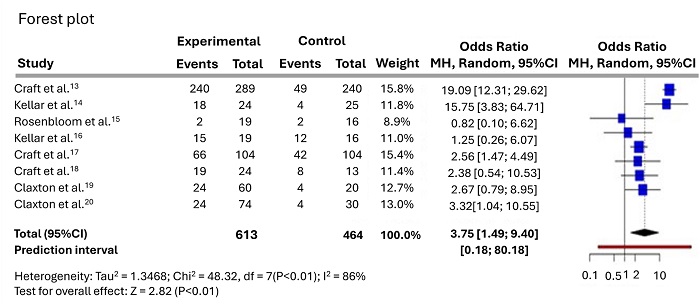 A total of eight studies were analyzed, including 594 participants in the experimental cohort and 438 participants in the placebo cohort. Based on the analysis performed using random-effects model with Mantel-Haenszel method to compare the OR, a statistical difference was observed between the two cohorts. The overall OR was 3.75 with a 95%CI of 1.49–9.4. The test for overall effect showed significance at p<0.05. Significant heterogeneity was detected (0), suggesting inconsistency in the magnitude and/or direction of effects. The I 2 value indicates that 85.5% of the variability among studies arises from heterogeneity rather than random chance ( Figure 4).
