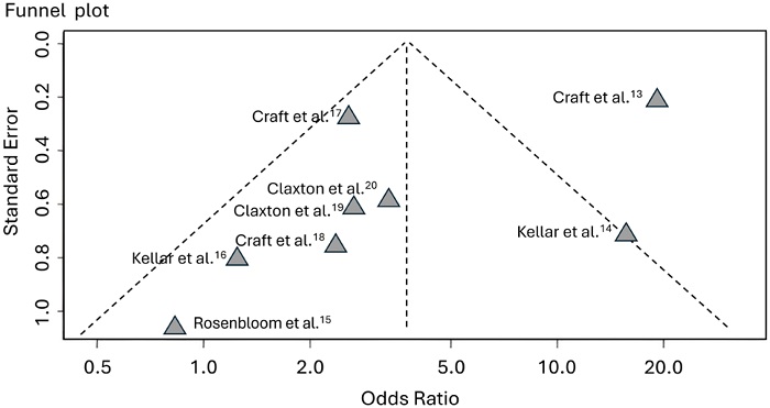 The funnel plot does not indicate potential publication bias. The Eggers’ test does not support the presence of funnel plot asymmetry (intercept: −2.77, 95%CI −5.98 to 0.44, t: −1.689, p 0.142) ( Figure 5).