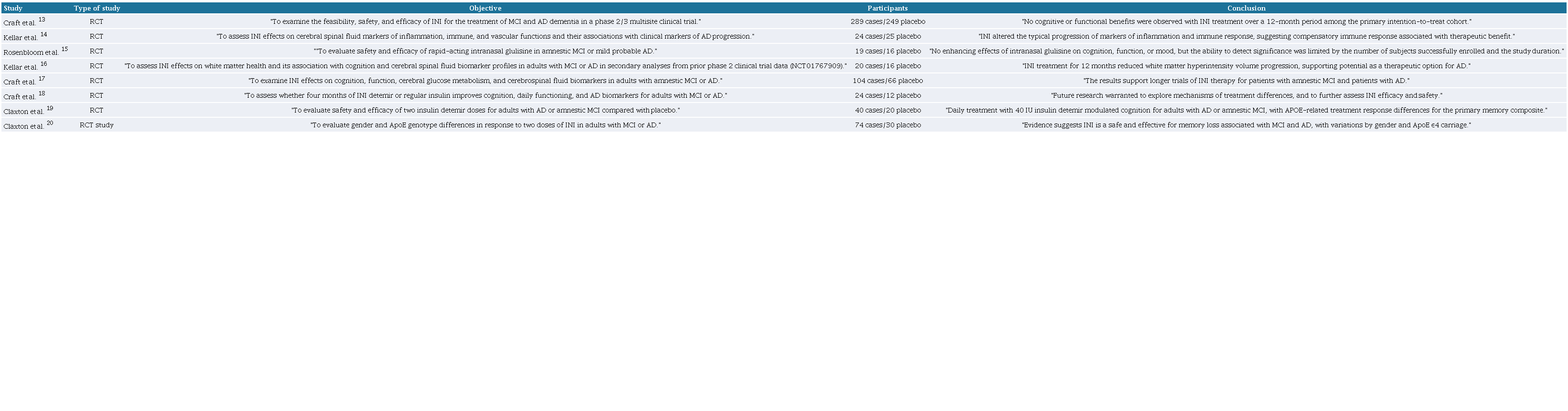 Increasing evidence suggests that AD shares pathophysiological similarities with type 2 diabetes, leading to the conceptualization of AD as "diabetes in situ" within the brain. By crossing the blood-brain barrier, INI therapy allows for the delivery of insulin directly to brain cells, maximizing its effect on the brain and with minimal systemic side effects. The aim of this study was to evaluate the efficacy of INI therapy for AD through a systematic review and meta-analysis of randomized clinical trials (RCTs).