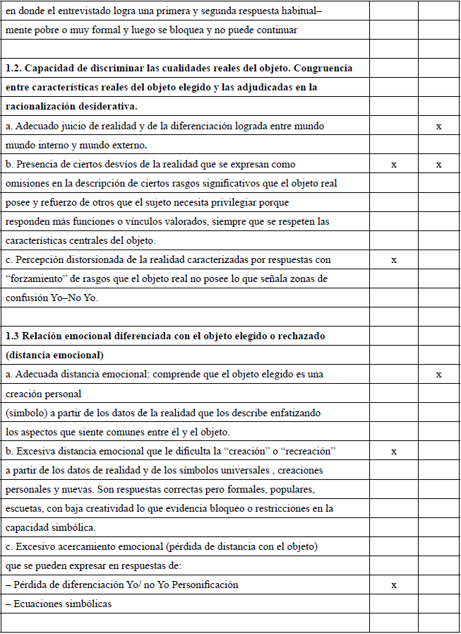 En el ítem II.1.c. No se detecta la posibilidad de análisis en el primer test ya que el análisis cede su lugar a respuestas convencionales o autorreferidas. En el retest se logra el análisis del objeto adecuado en algunas catexias y en otras aún no logra un análisis detallado del objeto para a partir de allí desarrollar los motivos que fundamentan el rechazo o elección de los mismos.