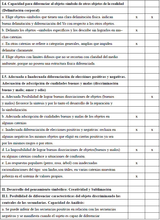 Elsa Grassano (2004, pp. 63–102) fundamentándose en la conceptualización de simbolización mencionada, ha sistematizado indicadores centrados en la investigación de dos áreas de desarrollo del aparato psíquico, exploradas con el CD (Guinzbourg y Celener) que hemos instrumentado para evaluar los cambios clínicos producidos, en el caso de un niño de la muestra de la investigación de tesis en curso. Dichos indicadores son: