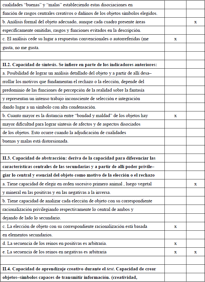 En el ítem II.3. La capacidad de abstracción no se da en el primer test porque no muestra la posibilidad de elegir en orden sucesivo los reinos que se espera en la positivas y en las negativas (en ambas catexias la secuencia es arbitraria). La elección de objetos con su correspondiente racionalización está basada en elementos secundarios. El cambio se produce en el retest en las catexias positivas eligiendo en orden sucesivo primero animal y luego vegetal y mineral, no así en las negativas donde se mantiene la arbitrariedad en el orden.