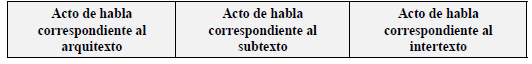 Organizamos las columnas en el orden que mostramos: arquitexto, subtexto e intertexto pues pensamos que el acto de habla correspondiente al arquitexto es el más observable mientras que el del subtexto y el del intertexto son inferencias que se hacen a partir de este.