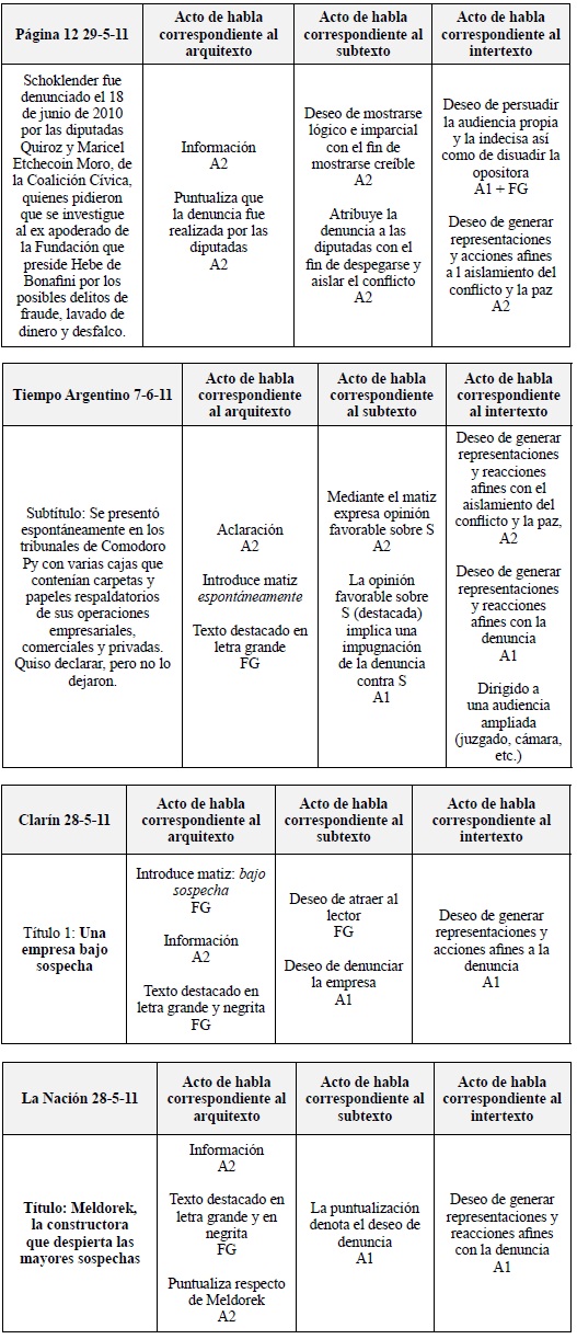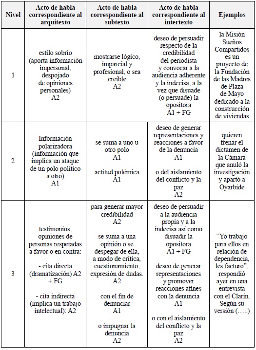Con el fin de darle uniformidad al diseño de la grilla de análisis de actos de habla del ADL para el análisis del discurso periodístico en general, y específicamente para el discurso sobre corrupción, utilizamos la denominación arquitexto (Adam, 1992) para designar el nivel de análisis semántico del discurso, subtexto (Nieremberg, 1990) para designar el nivel de análisis pragmático del discurso referido a la actitud del periodista, e intertexto (Kristeva, 1980) para designar el nivel de análisis pragmático del discurso referido a las representaciones y reacciones que el periodista desea generar en la audiencia.