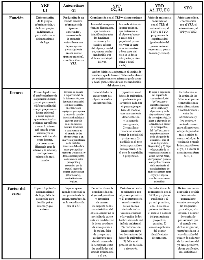 El marco conceptual de este trabajo se puede encontrar en la Tabla I, que contiene la categorización de los tipos de pensar (entendido cada uno como consecuencia de la sedimentación de un proceso de complejización del proceso cogitativo en el yo: yo real primitivo: YRP, autoerotismo, yo placer purificado: YPP, yo realidad definitivo: YRD, superyó-ideal del yo: SYO), de deseos implicados en cada pensar (libido intrasomática: LI, oral primario: O1, sádico oral secundario: O2, sádico anal primario: A1, sádico anal secundario: A2, fálico uretral: FU, fálico genital: FG), de funciones del pensamiento, de errores y de indicadores en los actos de habla. Estos deseos (y las defensas correspondientes) pueden ser estudiados apelando a los instrumentos del ADL (Maldavsky, 2013). En cuanto a la operacionalización de los conceptos, el central es el de pensamiento, que Freud (1923b) define como un desplazamiento de la energía anímica en el camino hacia la acción, por lo cual el método propone estudiar la secuencia discursiva del paciente en determinado segmento de la sesión. Como Freud (1915e) define, además, el pensar como un acto puramente interno, el método propone considerar, en el análisis del discurso, los actos del habla expresados por el paciente.