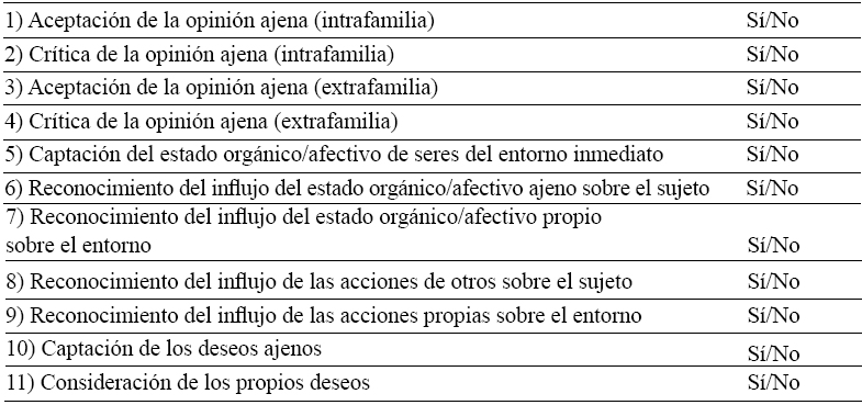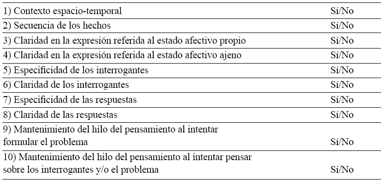 Para la evaluación de los rasgos formales del pensar, en cuanto a forma y contenido se propone un conjunto de instrumentos adicionales. Los rasgos del pensar pueden ser diferenciados en tres categorías: aspectos formales; aspectos de contenido; sensibilidad y procesamiento de los propios deseos y los ajenos. Cada una de estas categorías contiene diferentes ítems, y por ello cada una queda expresada en una Tabla, en la cual el investigador debe contestar por Sí o por No a cada uno de los 33 ítems (ver Tablas II,III,IV).