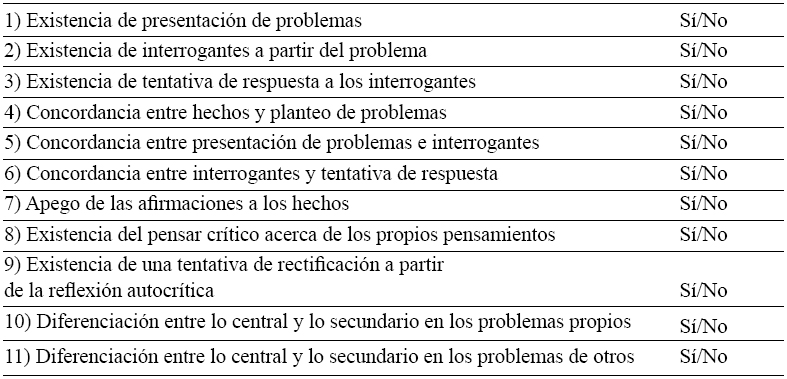 El criterio para la construcción de estas categorías consiste en tomar en cuenta el trabajo psíquico del pensar del proceso secundario. Esta actividad se diferencia de otros tipos de pensar por la mayor complejidad del trabajo cogitativo, tanto desde la perspectiva formal como en cuanto al contenido, pero en todo lo demás, como el conjunto de la vida psíquica, tiene como meta procesar los conflictos con los tres amos a los que el yo debe servidumbre: la pulsión, la realidad, el superyó. Algunas de las Tablas (sobre todo las Tablas II y III) fueron construidas siguiendo el criterio de la diferencia entre el pensar del proceso secundario respecto de actividades cogitativas más elementales, mientras que la Tabla IV considera también la relación entre el pensar y los deseos propios y ajenos en el marco vincular y los recíprocos influjos. La Tabla II presta atención a los rasgos formales del pensar, mientras que la Tabla III considera cuestiones de contenido en relación con los hechos y con la función auto evaluadora y crítica. También la Tabla IV toma en consideración aspectos del contenido del pensar en relación con los hechos, pero en este caso prestando atención tanto a los deseos propios y los de otros sujetos, como a los influjos recíprocos.