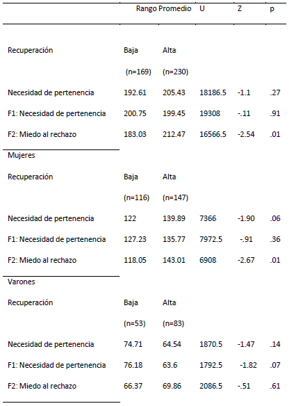 Se procedió a repetir el mismo análisis con el factor de inteligencia emocional recuperación. Se encontraron diferencias significativas en la muestra general en miedo al rechazo (U = 16566.5; Z = -2.54; p = .01) con un tamaño del efecto de -.16. En el caso de las mujeres se encontraron también diferencias significativas en miedo al rechazo (U = 6908; Z = -2.67; p = .00) con un tamaño del efecto bajo de .1 y en el caso de los varones no se hallaron diferencias significativas (ver Tabla 5).