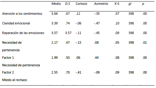 Se utilizó el estadístico Rho de Spearman para evaluar la relación entre los componentes de la inteligencia emocional y necesidad de pertenencia. Se aplicó una prueba U Mann Whitney para evaluar diferencias entre los géneros y las diferencias en los niveles de necesidad de pertenencia agrupando los adolescentes en grupos de alta y baja atención a los sentimientos, y alta y baja recuperación de los estados de ánimo negativos.