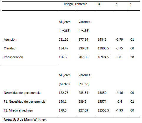 Finalmente, los varones presentaron mayores niveles de necesidad de pertenencia total y del factor necesidad de pertenencia, mientras que las mujeres presentaron mayores niveles del factor miedo al rechazo. Los resultados parecen indicar que los varones experimentan una mayor necesidad de experimentar aceptación social y su concomitante sensación de bienestar. En el caso de las mujeres parecería que es mayor el miedo a experimentar el rechazo social y sus consecuencias negativas.