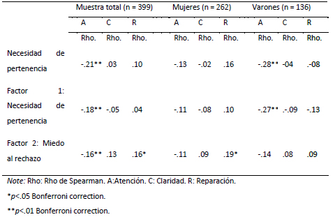 Al realizar correlaciones entre los componentes de inteligencia emocional y necesidad de pertenencia se halló en la muestra total una correlación significativa entre atención y miedo al rechazo (Rho=-.16, p=.01), el factor necesidad de pertenencia (Rho =-.18; p ˂ .01) y pertenencia total (Rho =-.21; p ˂ .01). Entre recuperación y miedo al rechazo (Rho =.16; p ˂ .01). En el caso de las mujeres se hallaron relaciones significativas entre recuperación y miedo al rechazo (Rho = .19.; p = .02). En el caso de los varones se hallaron correlaciones significativas entre atención y necesidad de pertenencia (Rho =--.28; p ˂ .01) y el factor necesidad de pertenencia (Rho =--.27; p ˂ .01) (ver Tabla 3).