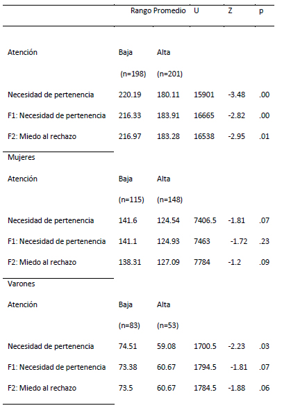 En función de la importancia que la atención a las emociones mostró en las correlaciones realizadas en la muestra total se procedió a comparar los niveles reportados por los adolescentes en el cuestionario necesidad de pertenencia, en función del nivel de atención a las emociones. En la muestra total se hallaron diferencias significativas en necesidad de pertenencia (U = 15901; Z = -3.48; p ˂ .00) con un tamaño del efecto de .20, el factor necesidad de pertenencia (U = 16665; Z = -2.82; p ˂ .00) con un tamaño del efecto de .16 y el factor miedo al rechazo (U = 16538; Z = -2.95; p = .01) con un tamaño del efecto de .17. En el grupo de varones se encontraron diferencias significativas en necesidad de pertenencia total (U = 1700.5; Z = -2.23; p = .03) con un tamaño del efecto de .22 de acuerdo al estadístico Delta de Cliff, mientras que en el grupo de mujeres no se hallaron diferencias significativas (ver Tabla 4).