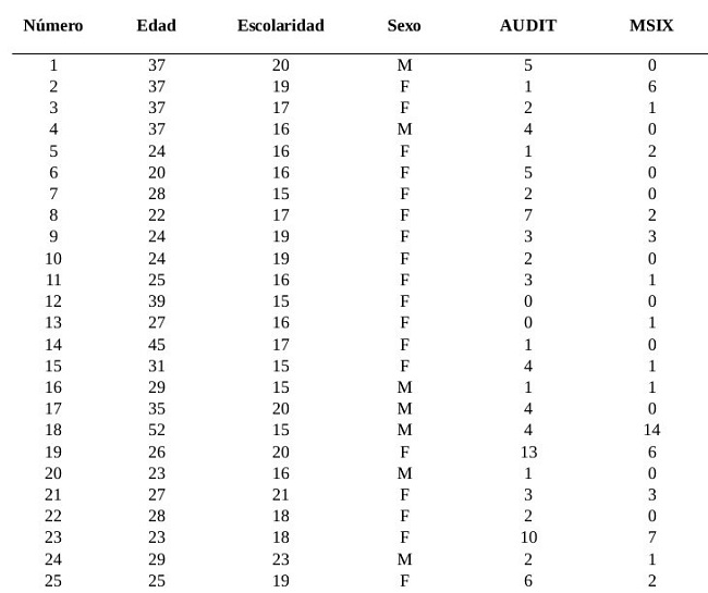 Es de destacar que en esta muestra ninguno de los participantes reportó antecedentes de consumo patológico de sustancias.