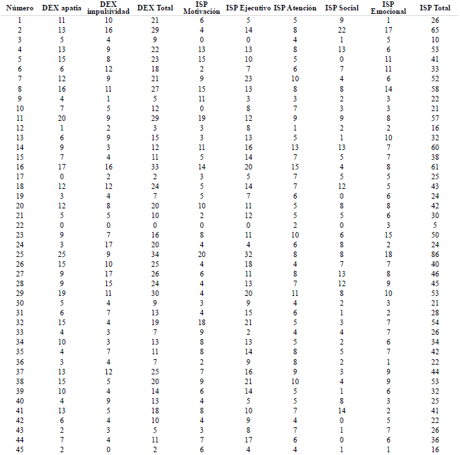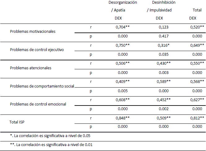 Los puntajes parciales y totales de ISP correlacionaron positiva y significativamente con los puntajes parciales y totales de DEX, demostrando validez convergente entre ambas escalas. El puntaje total del DEX y el puntaje de la subescala de desorganización/apatía del DEX correlacionaron con todos los puntajes del ISP. El puntaje de la subescala de desinhibición/impulsividad del DEX correlacionó con todos los puntajes del ISP menos problemas motivacionales. Esto es consistente con la naturaleza de los problemas indagados por la escala de desinhibición/impulsividad (pe. “tiendo a ser bastante activo, y no puedo quedarme quieto por mucho tiempo”) y la de problemas motivacionales (pe. “me cuesta ponerme en marcha, me falta energía”), que en muchas ocasiones se excluyen mutuamente.