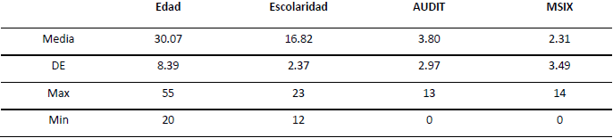 Los puntajes en el AUDIT variaron en función de la edad de los participantes. Los examinados menores de 28 años obtuvieron mayores puntajes en el AUDIT (t=2,542; p= 0,015), mostrando más dificultades asociadas al consumo de alcohol.