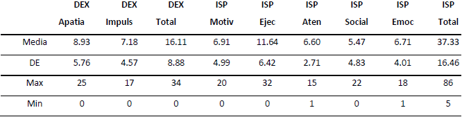 Para valorar la presencia de alteraciones ejecutivas se utilizó el Cuestionario Disejecutivo (DEX) (Wilson, Alderman, Burgess, Emslie & Evans, 1996; Querejeta et al., 2015), y el Inventario de Síntomas Prefrontales (ISP) (Ruiz Sánchez de León et al., 2012).