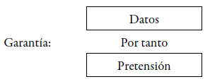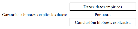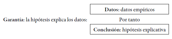 Aunque en la sección 3 veremos con más detalle cuáles son las características particulares de tal modo de argumentar, podemos adelantar que, de acuerdo con el modelo de Toulmin (2003 [1958]) y con la idea de una clasificación de esquemas argumentativos conforme a distintos «tipos de garantía», un argumento abductivo simple respondería al siguiente esquema (Cf. Marraud 2013, 241).