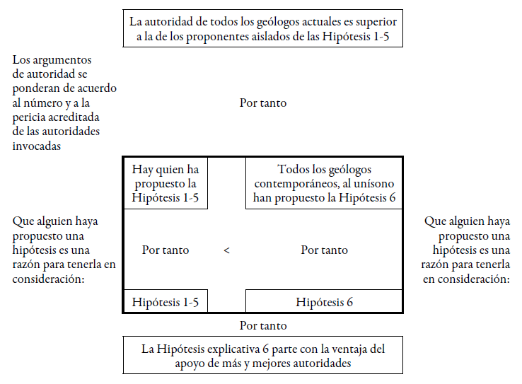 No se propone, por el momento, la revisión del poder explicativo de tales hipótesis, pero se aportan razones que podrían emplearse en una ponderación (conforme a sus propios estándares de evaluación) de los «argumentos de autoridad» que inicialmente las sostienen. Aunque, de nuevo, ello queda tan solo apuntado en el texto, podríamos hablar de que se está ofreciendo una ponderación de argumentos, en este caso doxásticos, es decir, una comparación que desemboca en un juicio evaluativo justificado a favor de uno de los comparandos, y que podríamos diagramar así: