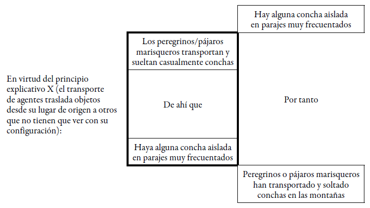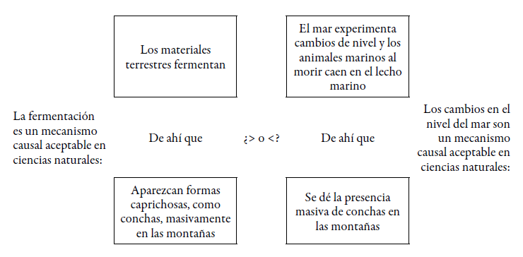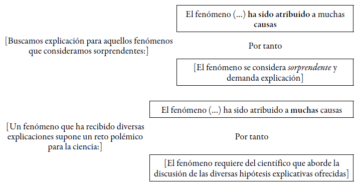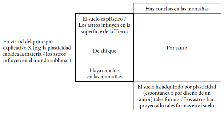 Se delimita el fenómeno del que se va a tratar, i.e. se explicitan los datos empíricos constatables y supuestamente compartidos: «Hay conchas que se encuentran en las rocas a una gran altura sobre el nivel del mar» y se aporta una justificación de que se trata, en efecto, de un fenómeno sorprendente, en el sentido de que requiere explicación. La razón que se aporta es que ya se han dado varias. Es más, se han dado ya muchas y alternativas, lo que justifica el requisito de que se discutan y ponderen las ya ofrecidas (que es lo que el autor/argumentador se dispone a hacer). Se trata de evitar con ello la posible objeción procedimental de no encontrarnos ante lo que se llamaría un contexto abductivo, un contexto presidido por la condición de anomalía o extrañeza ante unos datos constatables, mencionada por Peirce y por muchos otros teóricos de la abducción.19 La existencia de un abanico de explicaciones alternativas muestra la necesidad sentida hasta el momento de buscar una, aunque siempre queda abierta la posibilidad de replicar que ello no es preciso y que los fenómenos mencionados son esperables, dadas las teorías o «ideales de orden natural» (Toulmin 1961) vigentes. Podemos diagramar los argumentos (bastante «implícitos») de esta primera sección así:
