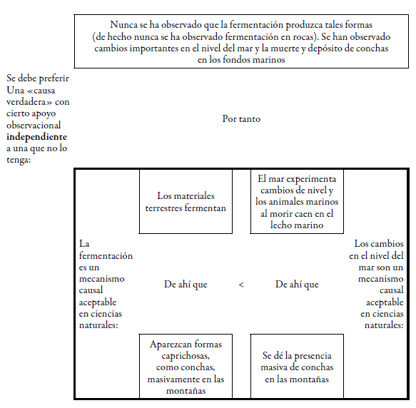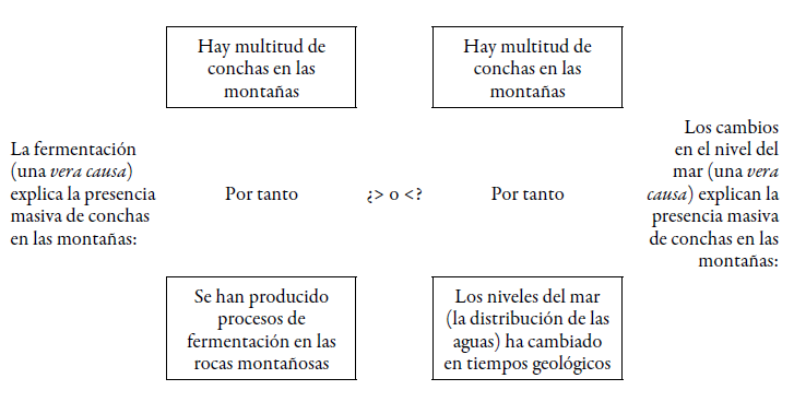 El fenómeno de las conchas que se encuentran en las rocas a una gran altura sobre el nivel del mar ha sido atribuido a muchas causas. Algunos lo han atribuido a la virtud plástica del suelo; otros lo atribuyen a la fermentación; otros a la influencia de los cuerpos celestes; otros al paso de los peregrinos comedores de ostras; otros a pájaros que se alimentan de mariscos; y todos los geólogos contemporáneos, al unísono, a la vida y la muerte de moluscos reales en el fondo del mar, y a la subsecuente alteración del nivel relativo de la tierra y del mar. De estas causas posibles, la virtud plástica y la influencia celeste son meras fantasías. El transporte casual de los peregrinos es una causa verdadera, y tal vez dé cuenta de la presencia de una que otra concha aquí y allá, botada en pasajes muy frecuentados, pero no es suficientemente extensa para los propósitos de la explicación. La fermentación suele ser una causa real, en tanto que tal cosa existe; pero no es una causa real (verdadera) de la producción de una concha en una roca, puesto que tal efecto nunca ha sido observado, y las rocas y las piedras no se fermentan. Por otro lado, que una ostra se muera y que su concha se quede enterrada en el barro del fondo marino es algo que sucede a menudo; y la elevación del fondo del océano hasta convertirse en tierra sobre el nivel del mar ha sido realmente observada muchas veces, y en una escala tal que nos permite calificar a esta causa de una vera causa y ponerla a la disposición de una filosofía correcta.