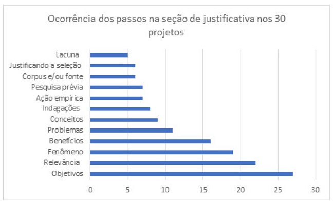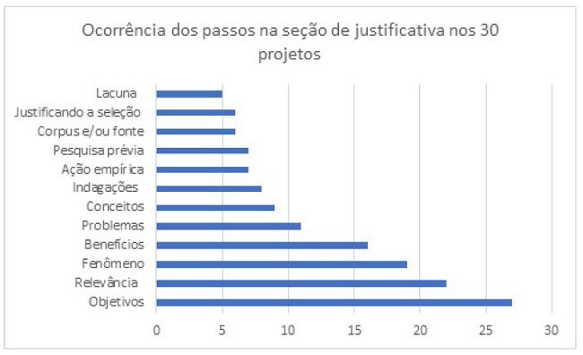 Nos casos em que um passo apareceu mais de uma vez numa seção, e essa ocorrência tenha sido intercalada por outros passos, este passo foi computado mais de uma vez. Todos os passos encontrados foram catalogados num primeiro momento. em um segundo momento, operou-se com um corte de 16,6% (ou 6 de um total de 30) de ocorrência em projetos diferentes, de modo que passos que ocorreram em menos de 16,6% (ou 6 de um total de 30) dos pré-projetos foram descartados na análise final. Feita a catalogação dos passos retóricos, passou-se a analisá-los em conjunto para se avaliar quais passos eram congruentes entre si, no sentido de girarem em torno de aspectos tradicionalmente esperados para ocorrerem em seções de justificativa, como lacuna de pesquisa, relato de estudos prévios, relevância e benefícios da pesquisa, ou em outras seções como objetivos, discussão e conclusões.
