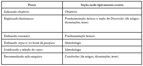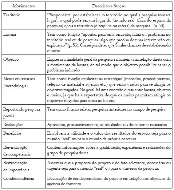 Em sua pesquisa, Connor e Mauranen (1999, p. 53) identificaram dez movimentos regulares em projetos de pesquisa de pesquisadores experientes.2