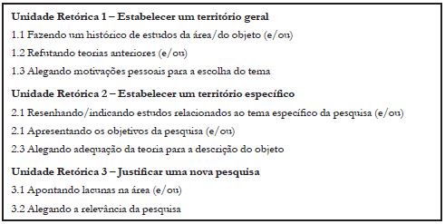 Uma descrição da organização retórica específica para a seção de justificativa é feita por Jucá (2006), conforme apresentada no Quadro 3, a qual resulta de uma adaptação do modelo CARS (SWALE, 1990), originalmente decorrente de análises de introduções de artigos de pesquisa. Jucá opta pelos termos unidade e subunidade correspondendo à categoria movimento passo na proposta inicial de Swales (1990).