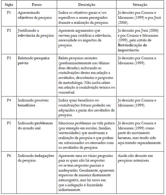A análise das trinta seções, mantendo-se apenas os passos com recorrência superior a 16,6% do total de trinta projetos, resultou num quadro com doze passos (Tabela 2), sendo que oito desses já haviam sido descritos em pesquisas anteriores, mesmo que para outras seções de projetos que não a justificativa. Os outros quatro passos retóricos que ainda não haviam sido descritos para a seção de justificativa de projetos de pesquisa são: indicando indagações da pesquisa; recomendando e/ou prescrevendo ação empírica; definindo conceitos; e explicando um fenômeno.