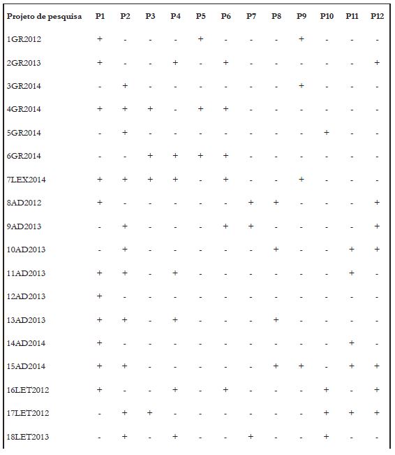 A observação de quais passos se fazem presentes em cada um dos projetos (Tabela 3) evidencia que não há nenhum presente em todos os projetos, sendo mais recorrentes os passos P1, P2, P4 e P12. Esse dado justifica por si mesmo a impossibilidade de falar, com base nesta amostra, em passos obrigatórios para essa seção ou em um modelo de organização retórica. Além disso, não há nenhum caso de duas seções que possuam exatamente os mesmos passos distribuídos numa mesma sequência, o que indica se tratar de uma seção cuja organização retórica é bastante instável e pouco convencionada.
