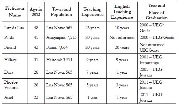 The empirical material used in this article was generated in a town called Cidade de Goiás (24,7394 inhabitants), in the state of Goiás, Brazil, in March and April 2013. All the eight teachers travelled from smaller towns near Cidade de Goiás to take the course. Only the data of seven teachers will be analyzed here because one of them had never taught English. She was taking the course because she wanted to become an English teacher. The following chart shows the participant’s profile: