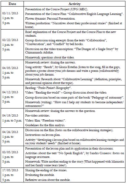 The teacher educator, the second author of this text, was 33 years old in 2013. Every week she travelled 140 km from Goiânia to Cidade de Goiás to teach the course. As mentioned, she acted both as a teacher educator and as a researcher. Here is a chart of the activities she offered in the first module of the course, called “Collaborative Teaching”,6 which aimed to reflect on the importance of interaction and collaborative activities in the process of English teaching and learning.