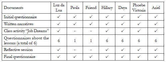 The empirical material encompasses an initial questionnaire (IQ), written narratives about the participants’ teacher education and professional profiles (WN), a class activity titled “job dreams” (CA), questionnaires about the lessons (QL), a reflective session at the end of the module (RS), and a final questionnaire (FQ). Except for the class activities, the empirical material was generated in Portuguese; therefore, the analysis the teachers’ speech are translated into English, but we have tried to be as faithful to the original as possible. Moreover, their speech in English that sounded ungrammatical to our ears was adapted, so as to avoid more constraints concerning their difficulties with English than those that are mentioned by them in the discussion sections of this article.
