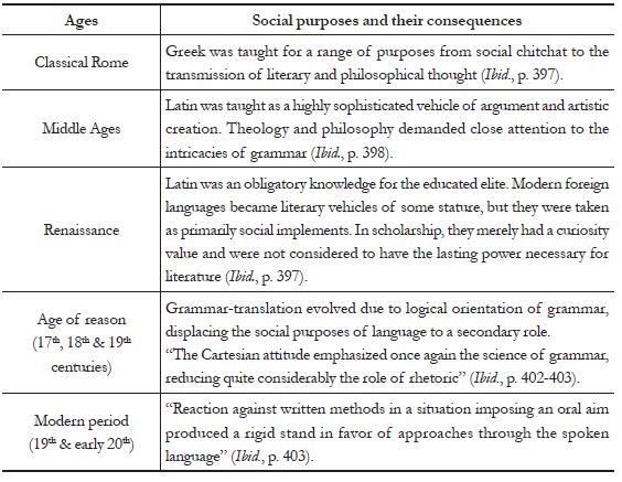 Thus, based on the study by Kelly (1969), entitled 25 Centuries of Language Teaching, we can understand the development of foreign language methods in the West throughout the centuries since the Roman Empire through two major purposes for the use of foreign language (communication versus analysis), which shifted according to the major social needs that have characterized each era (see Table 2). In this light, Kelly (1969) argues that the regular changes of three broad aims - (i) the social, (ii) the artistic or literary, and (iii) the philosophical - demand language to be regarded in different ways: (i) as a form of social behavior and a type of communication; (ii) as a creative activity; (iii) as an object of analysis (Ibid., p. 396). Therefore, according to Kelly (1969, p. 397):
