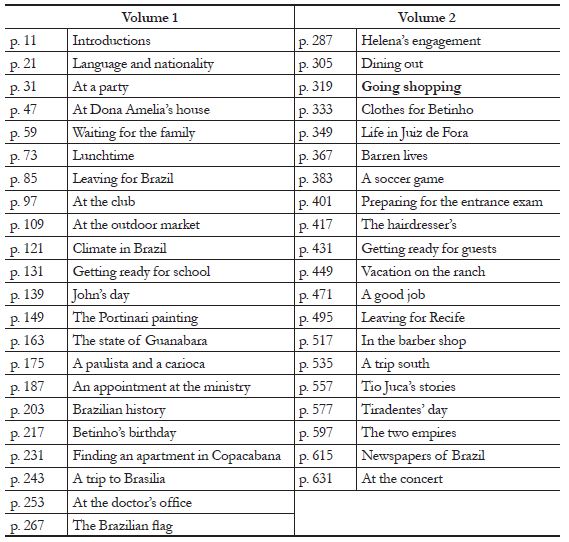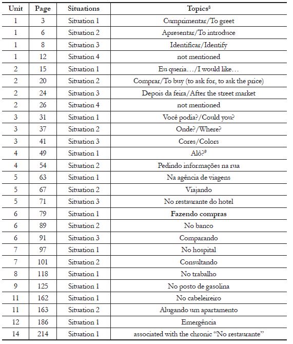 In this textbook, in both volumes, every unit begins with a dialog that is always presented in Portuguese and English. We undertand it is because of the orality intended in the textbook that the sentence structure is formal and does not correspond to the typical uses of oral language. We also note that the topic discussed serves as a reference for the entire unit. In the first volume there are 22 units and in the second another 20, which deal with a variety of subjects (Table 3).