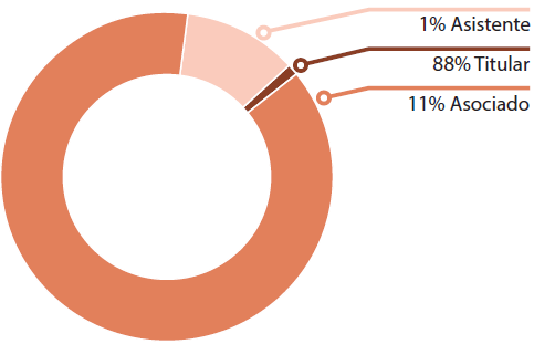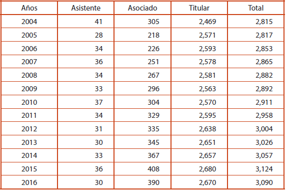 Partamos de tener en cuenta la tasa de crecimiento en el número de académicos desde 2004 hasta 2015 el cual muestra un decremento de -0.011 puntos porcentuales. Ahora bien, en relación a los niveles, estos se han mantenido en un promedio del 11% con profesores asociados y el 88% de titulares, tomando en consideración al total de la planta docente de tiempo completo, medio tiempo y tiempo parcial. No obstante, cuando se hace la revisión en relación a la planta de tiempo completo varía ostensiblemente al pasar a un promedio del 93% con profesores titulares (Tabla 1).