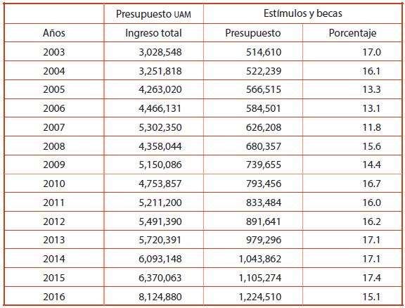 Al día de hoy las becas y estímulos han permanecido, el promedio destinado por la Universidad a becas y estímulos entre 2003 y 2015 ha sido constante, 15.5% del presupuesto total, lo que da pauta para señalar que el monto destinado siempre se va mantener para una parte específica de la planta docente (Tabla 2).